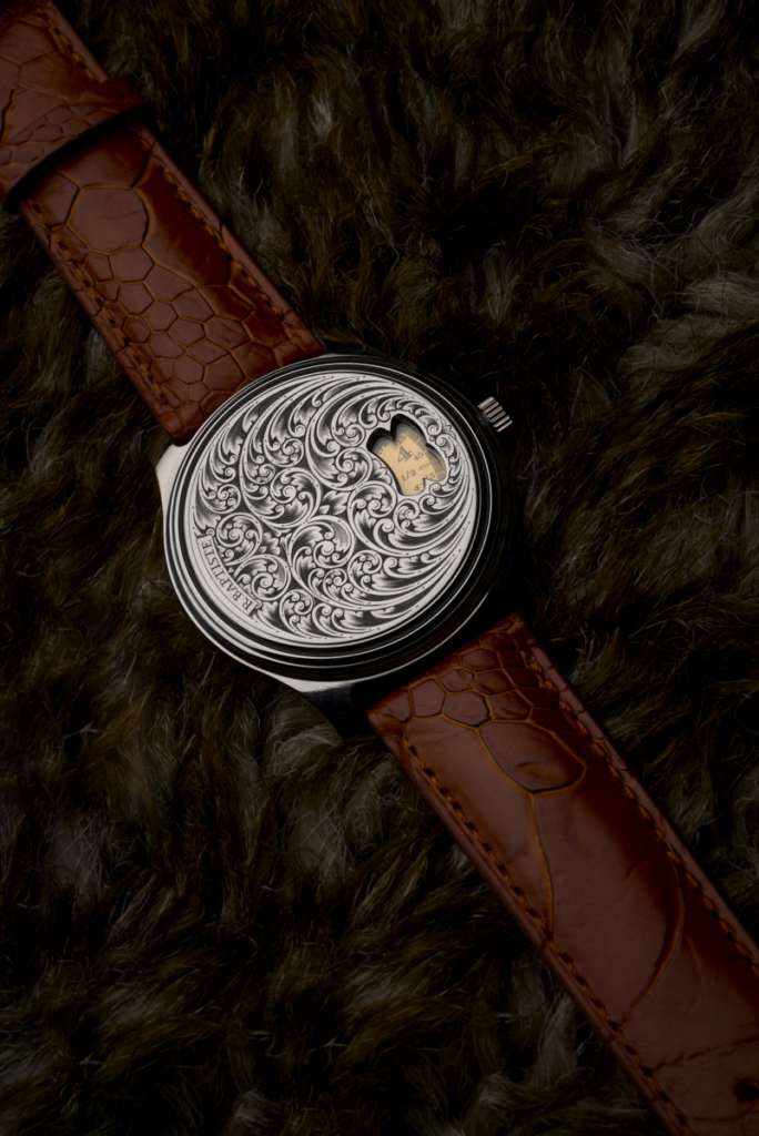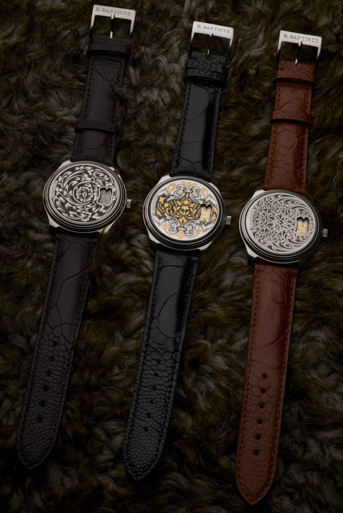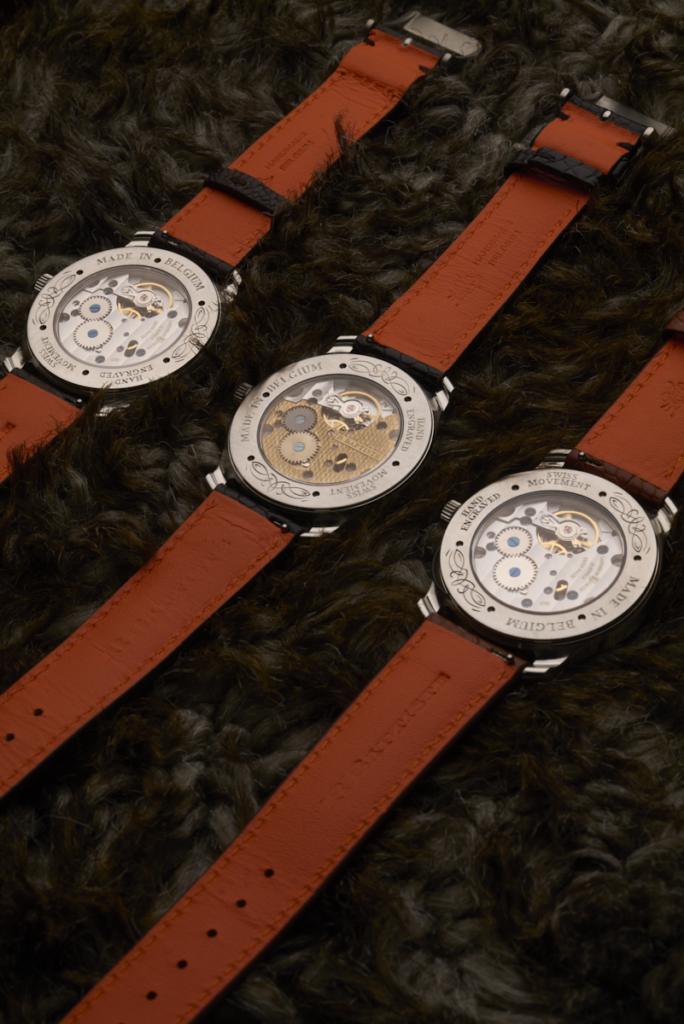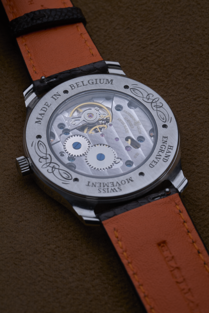 Le modèle LEOPOLD est le premièr modèle RBaptiste équipé d’un mouvement à remontage manuel et un fond visible faisant découvrir le mouvement.